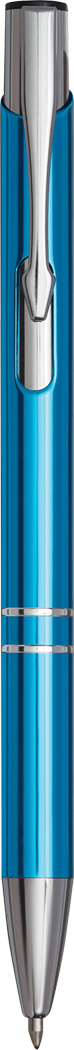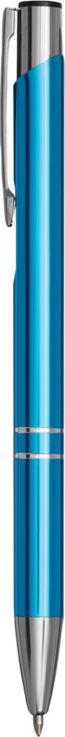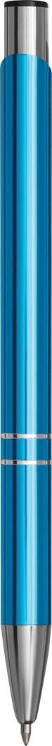 Hliníkové kuličkové pero má lesklé kovové tělo a klip, velkokapacitní náplň s modrým inkoustem, tlačítkový mechanismus. Rozměr: 13,7 cm