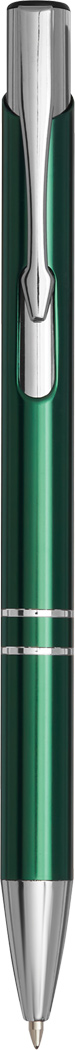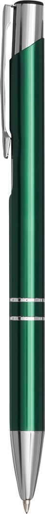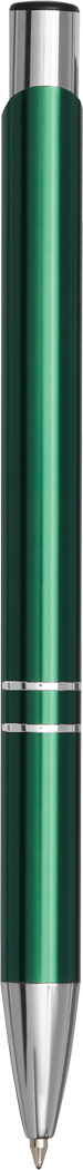 Hliníkové kuličkové pero má lesklé kovové tělo a klip, velkokapacitní náplň s modrým inkoustem, tlačítkový mechanismus. Rozměr: 13,7 cm