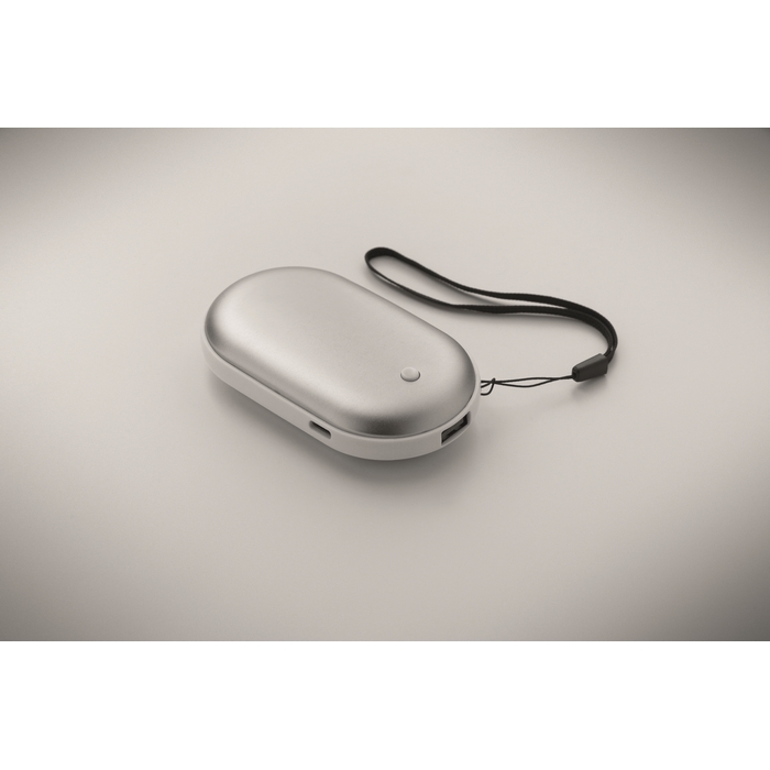 Hliníkový ohřívač rukou se 3 stupni teploty (45 °C, 50 °C, 55 °C) a vestavěnou powerbankou 5000 mAh. Oboustranné vyhřívání. Vstup/výstup Type-C, výstup USB-A. DC5V/2A. Součástí je nabíjecí kabel. Rozměry: 10 x 5.9 x 2.3 cm