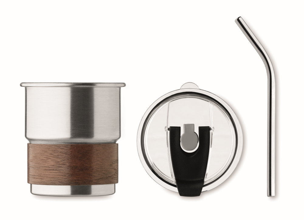 Jednostěnný pohárek z recyklované nerezové oceli (90 % recyklované nerezové oceli a 10 % nerezové oceli) s odnímatelným úchytem z akáciového dřeva. Víčko s pítkem a nerezovým brčkem. Objem: 260 ml. Rozměry: O 8 x 9 cm