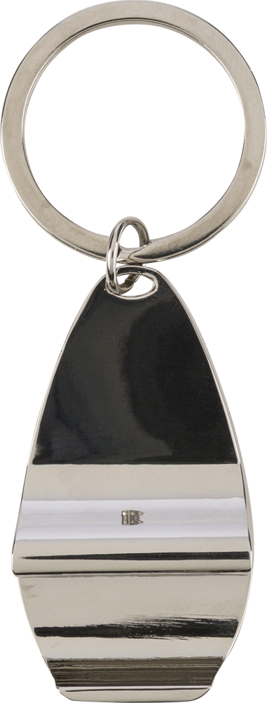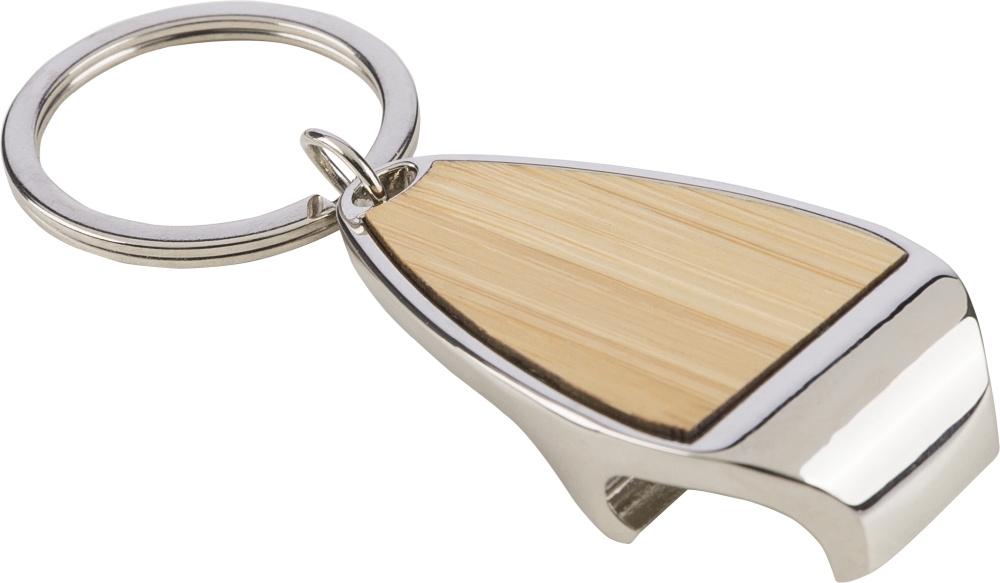 Přívěsek na klíče ze zinkové slitiny s kovovým kroužkem a bambusovou intarzií na přední straně. S funkcí otvíráku lahví. Baleno v papírovém sáčku. Rozměry: 10 cm x 52 cm