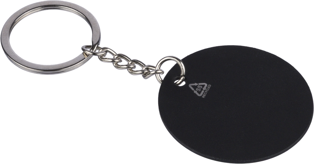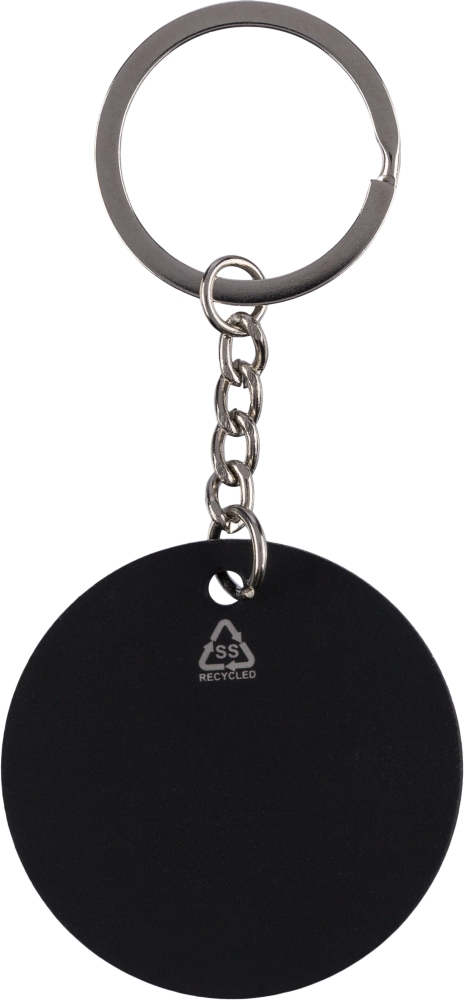 Klíčenka z recyklované nerezové oceli s pogumovaným kovovým kroužkem kulatého tvaru. S gravírovaným logem z recyklovaného materiálu, které po gravírování odhaluje lesklý zrcadlový efekt. Jednotlivě baleno v obálce z kraftového papíru. Rozměry: 3,2 cm x 0,5 cm x 5,2 cm