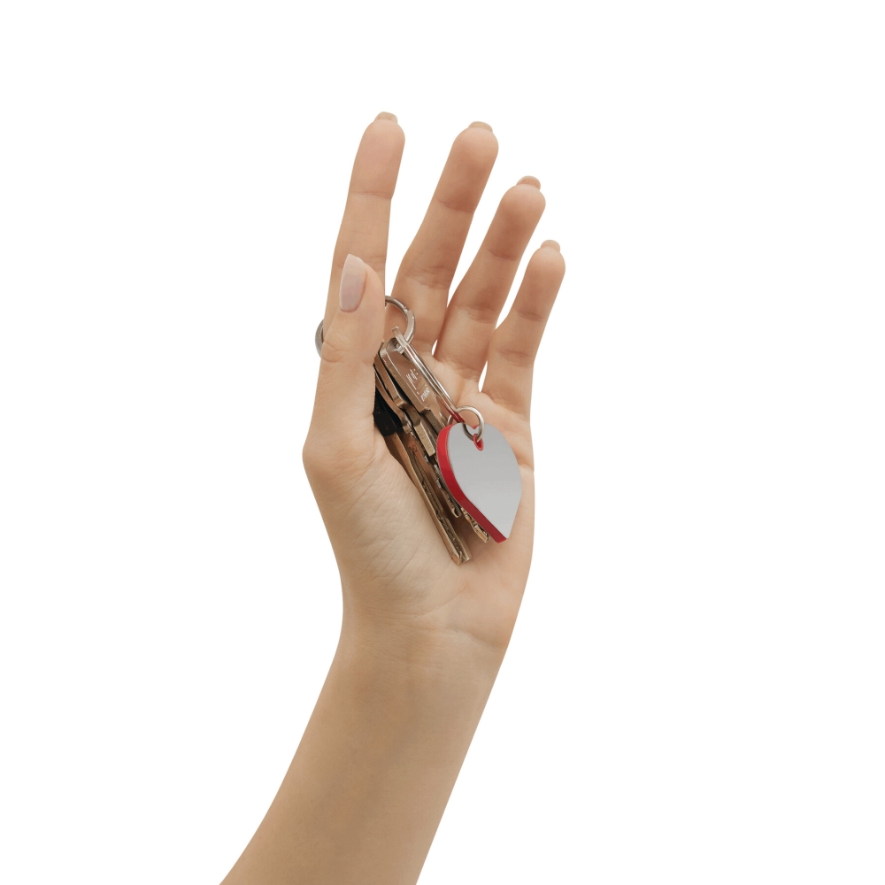 Klíčenka, červené plastové srdce mezi vysoce lesklými leštěnými ocelovými srdíčky. Rozměry: 4,3 x 3,5 x 0,4 cm
