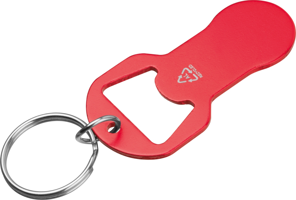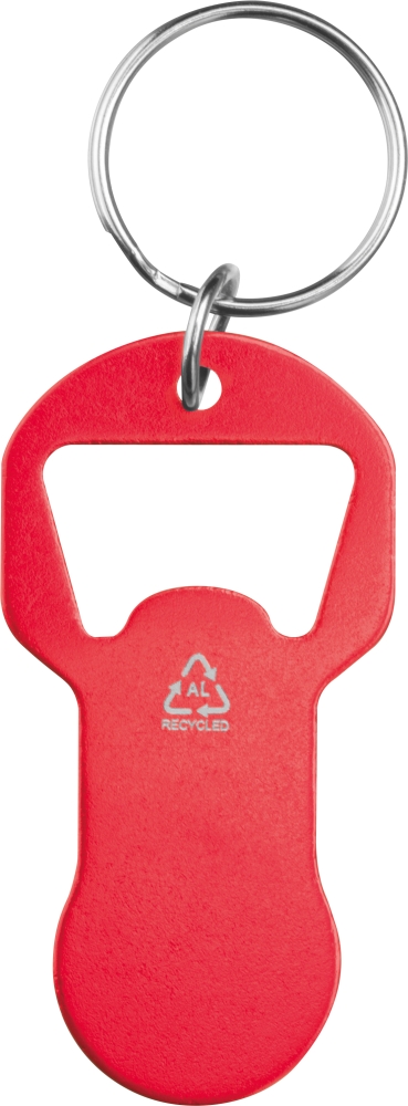 Klíčenka z recyklovaného hliníku s integrovaným otvírákem na lahve a žetonem do nákupního vozíku. Lehká, praktická a ideální na každodenní použití. Rozměry: 6,1 x 3,1 x 0,2 cm