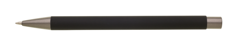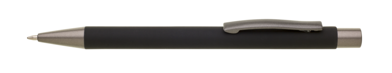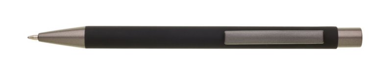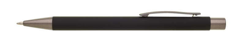 Kovová propiska s hnědo-černými doplňky, s pogumovaným povrchem. Velkoobjemová modrá náplň.