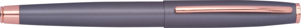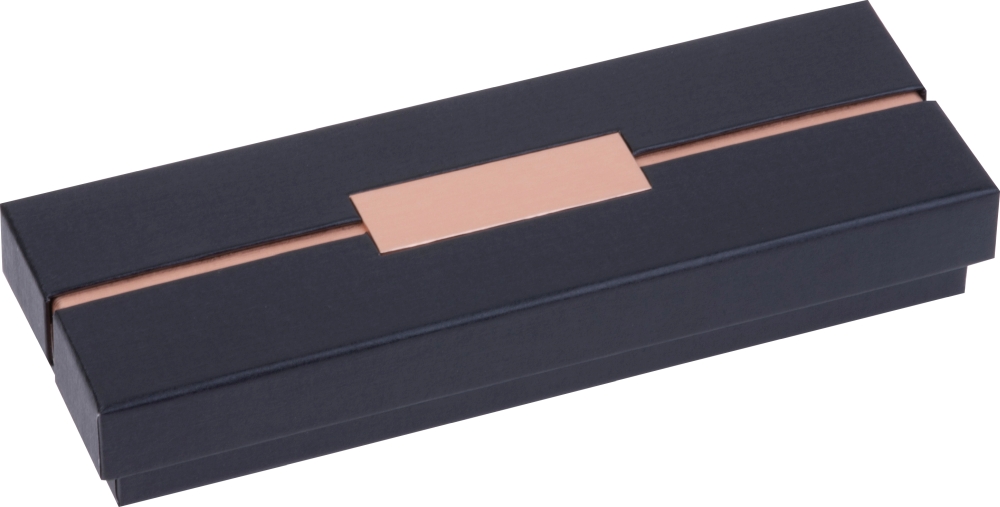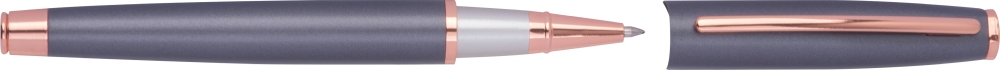 Kovová psací sada CrisMa, skládá se z kuličkového pera a rolleru z kovu s detaily v barvě rosegold. Obě pera píší modře a sú balené v čiea jsou balené v černé kartonové krabičce. Rozměry: 18 x 6,2 x 2,8 cm