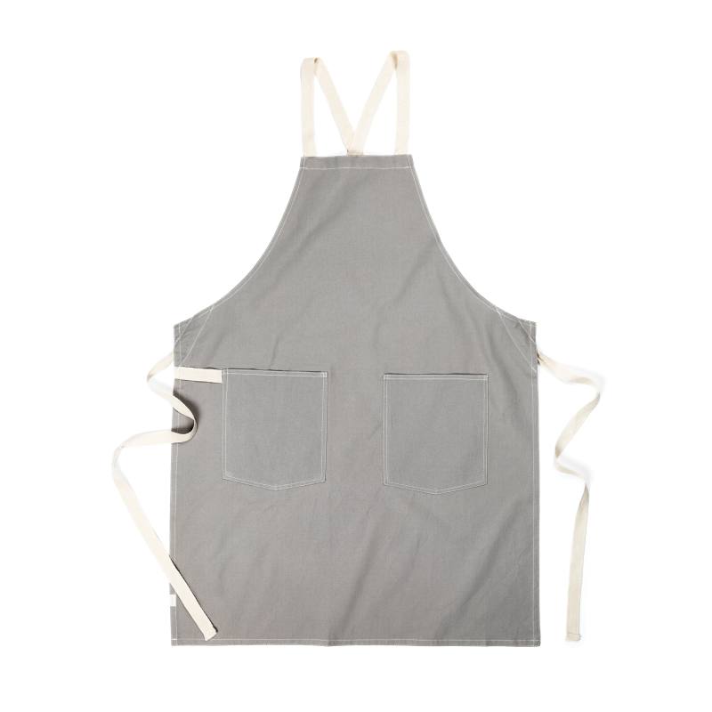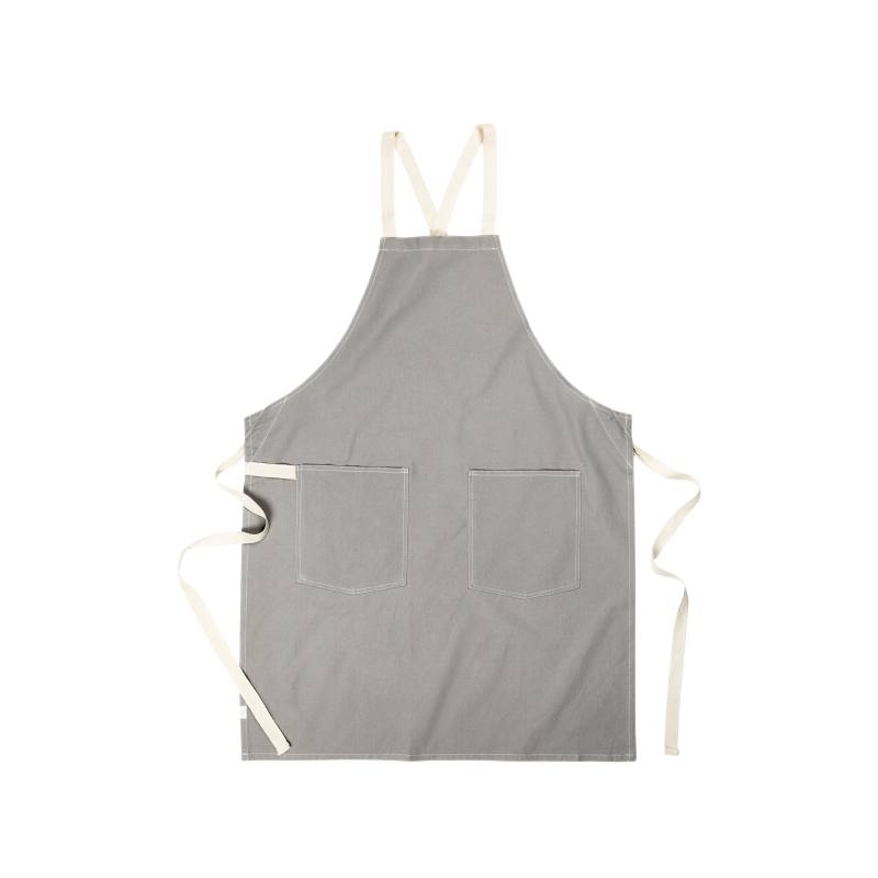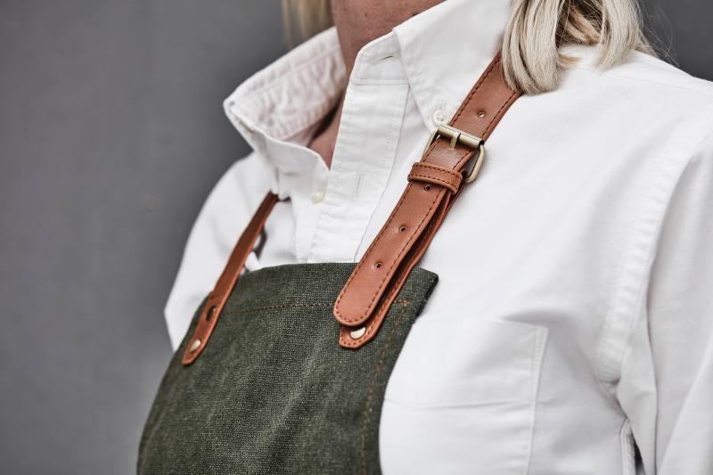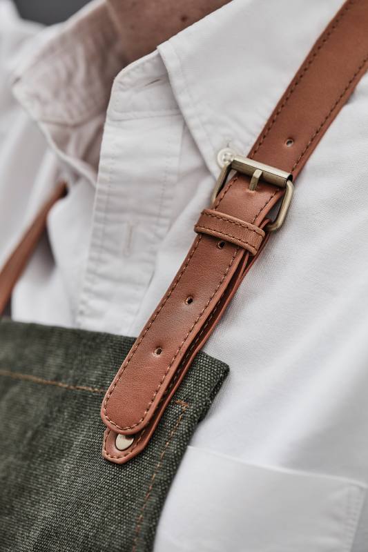 Robustní zástěra ze sepraného plátna 500 g/m2 s detaily z veganské kůže. Zástěra, která stárne důstojně.