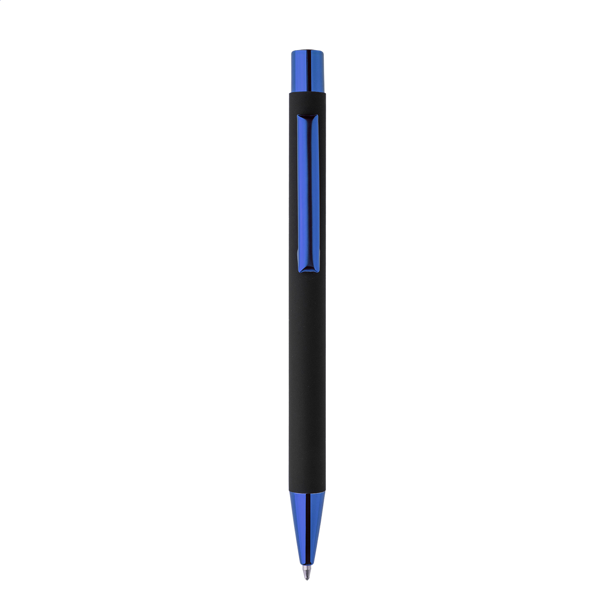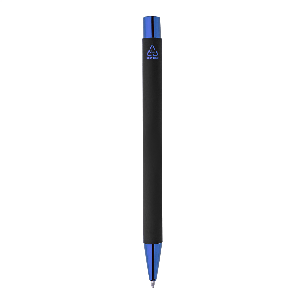 Kuličkové pero z recyklovaného hliníku s černým pogumovaným tělem a barevnými lesklými kovovými částmi. Se speciálním povrchem pro zrcadlové gravírování, které ladí s kovovými částmi. S modrou náplní.