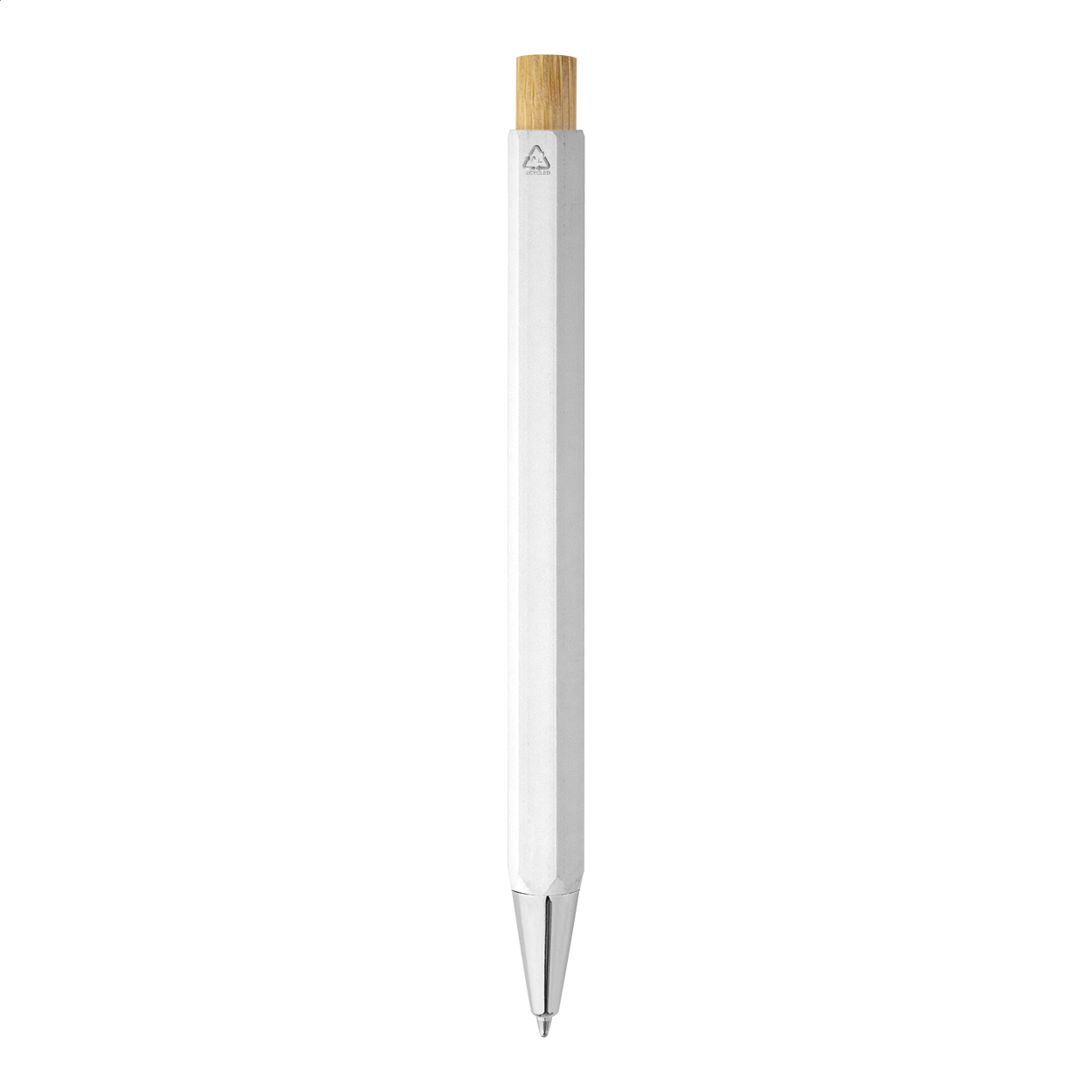 Šestihranné kuličkové pero z recyklovaného hliníku s bambusovým tlačítkem a chromovanými částmi. S modrou náplní.