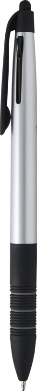 Kuličkové pero 3 v 1 je všestranný psací nástroj vyrobený z ABS plastu s certifikací RCS s moderním kovovým povrchem a integrovaným stylusem pro použití na dotykové obrazovce. Je vybaveno mechanismem pro snadné přepínání mezi černým, modrým a červeným inkoustem. Ergonomická rukojeť s černou protiskluzovou gumou a šedými kroužky zajišťuje pohodlnou manipulaci. Kompaktní, funkční a ideální pro branding – pero Trine je perfektní pro psaní poznámek, prezentace nebo digitální interakci. Recyklovaný ABS plast.