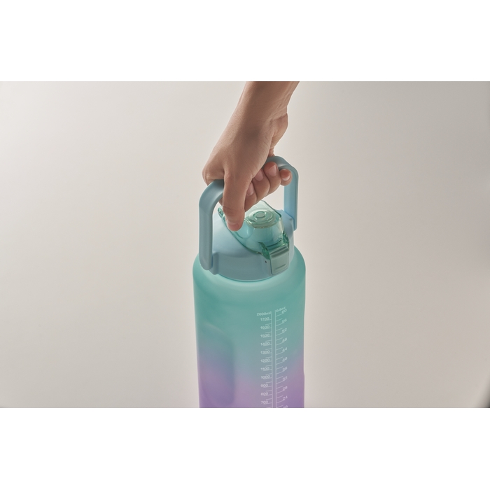 Motivační láhev na vodu z RPET. Víčko s brčkem, které se otevírá jednou rukou. Bezpečnostní zámek a rukojeť. Neteče. Objem: 2000 ml. Rozměry: O11 x 30 cm