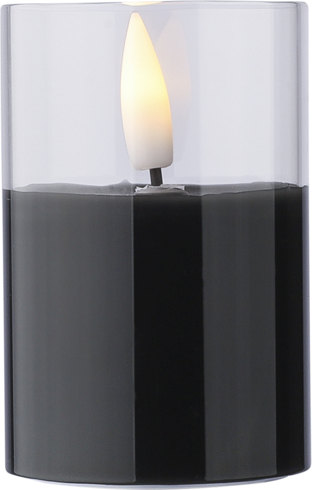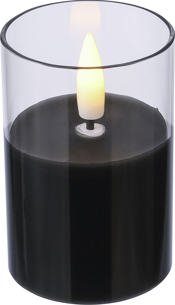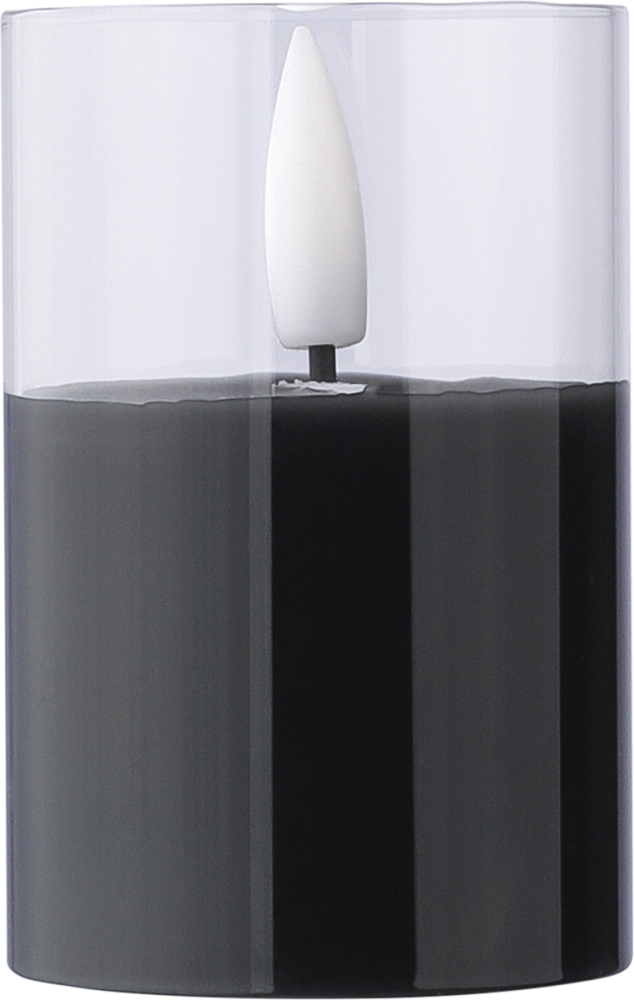 PP LED vosková svíčka ve skleněném držáku s realistickým efektem plamene. Včetně baterie a nabízí přibližně 100 hodin svícení. Určeno pro vnitřní použití. Jednotlivě baleno v hnědé kartonové krabici. Rozměry: 5 x 7,5 cm