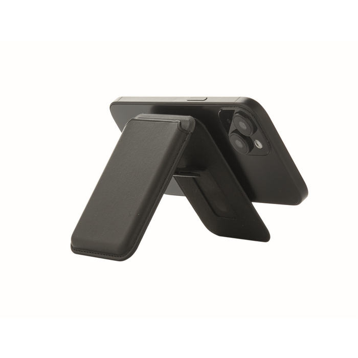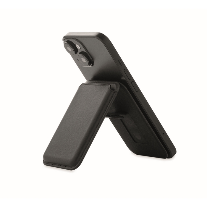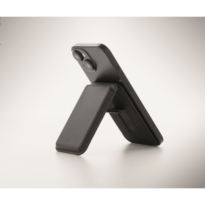 Magnetické pouzdro na kreditní karty z PU kůže (pro 3 karty) se stojánkem. Součástí je i další kovový kroužek. Rozměry: 6.5 x 9.5 x 1 cm