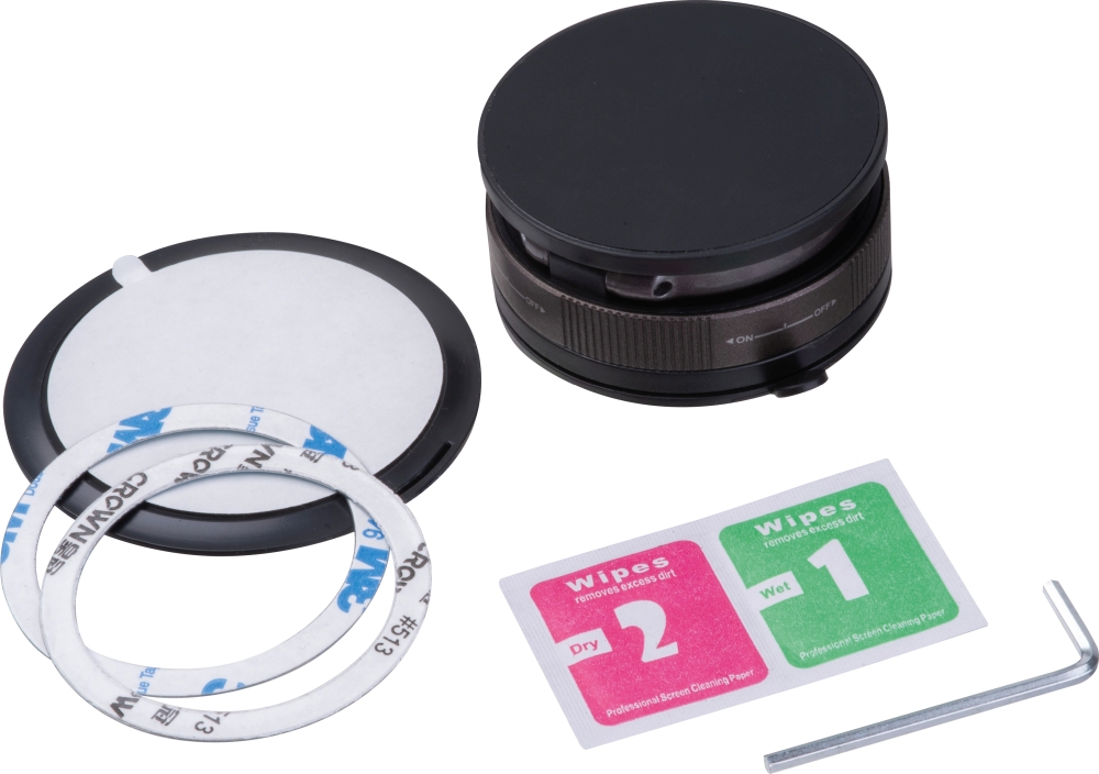 Pevný magnetický držák na telefon z PE. 2x magnetické kroužky, 1x lepící podložka, 1x imbusový klíč, 1x suché a vlhké ubrousky. Rozměry: o 6 x 2,8 cm