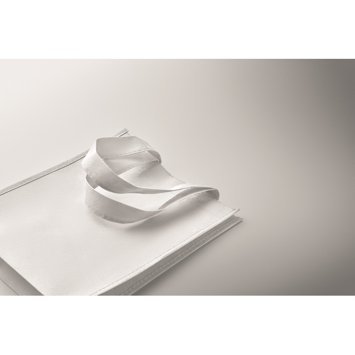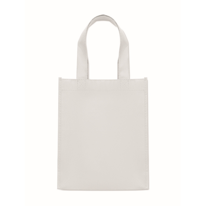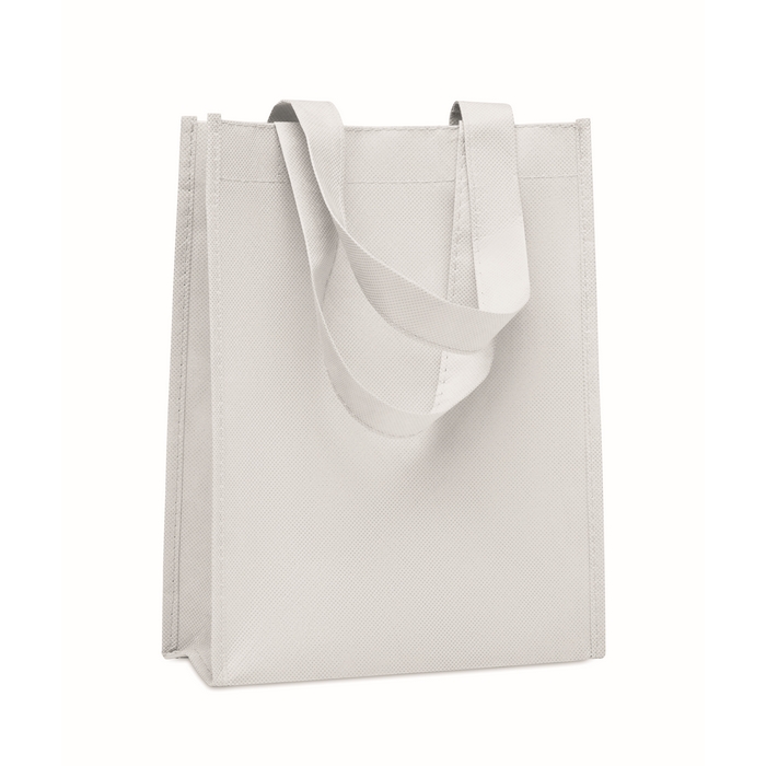Malá dárková taška z netkané 80g RPET textilie s krátkými uchy a klíny.Rozměry: 20 x 8 x 25cm