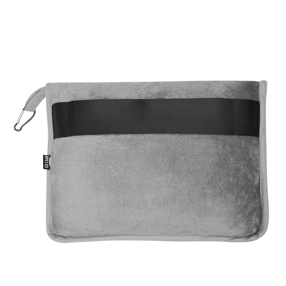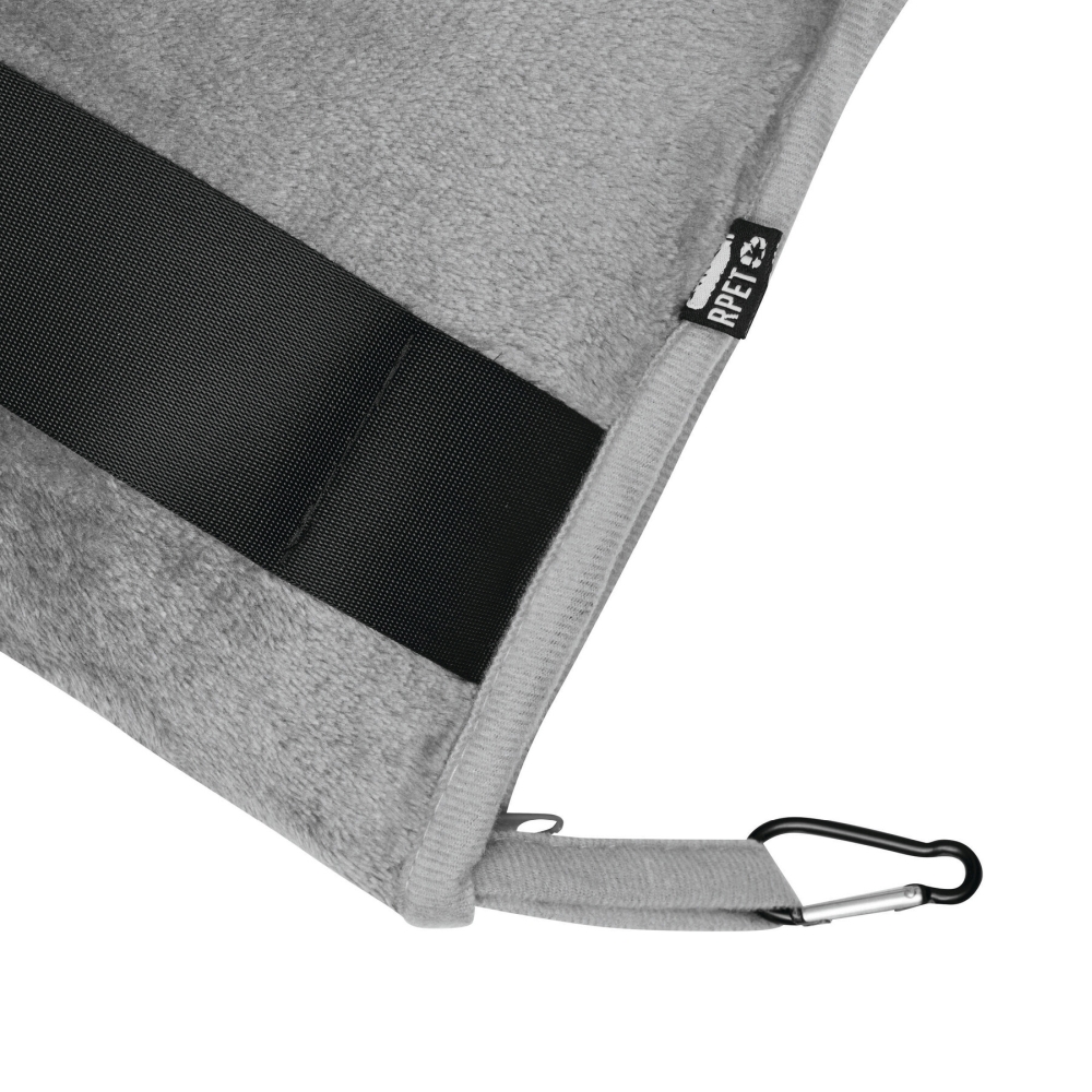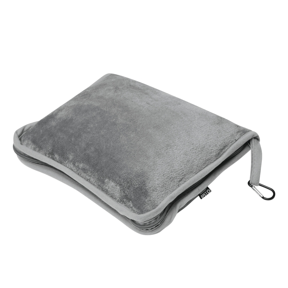 Cestovní deka ze 100% rPET, měkká a příjemná na dotek díky plyšovému fleecu, pratelná, v tašce se zapínáním na zip, s poutkem s malou karabinou (karabina NENÍ vhodná pro lezení) a popruhem pro připwvnění na cestovní kufr, deku lze složit a použít jako polštář uvnitř tašky. Rozměry: 150 x 100 / 35 x 25 cm