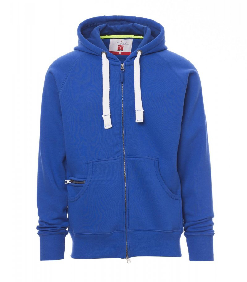 Pánská mikina s plastovým skrytým celozipem SBS s dvojitým kovovým jezdcem, kapuce s dvojitým prošitím, bílá stahovací šňůrka se sladěným prošitím a s kovovými kroužky, raglánové rukávy, klokaní kapsa, kapsička na zip, manžety a pas s elastickým žebrováním, zesílené švy. Gramáž 300g/m2. Materiál 70% bavlna a 30% polyester.