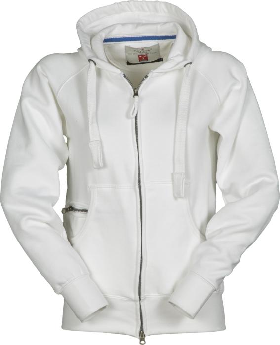 Dámská vyštíhlená mikina s kapucí s plastovým skrytým celozipem SBS s dvojitým kovovým jezdcem, kapucí s dvojitým prošitím, bílá stahovací šňůrka se sladěným prošitím a s kovovými kroužky, raglánové rukávy, klokaní kapsa s kapsičkou na zip, manžety a pas s elastickým žebrováním, zesílené švy. Gramáž 300g/m2. Materiál 70% bavlna a 30% polyester.