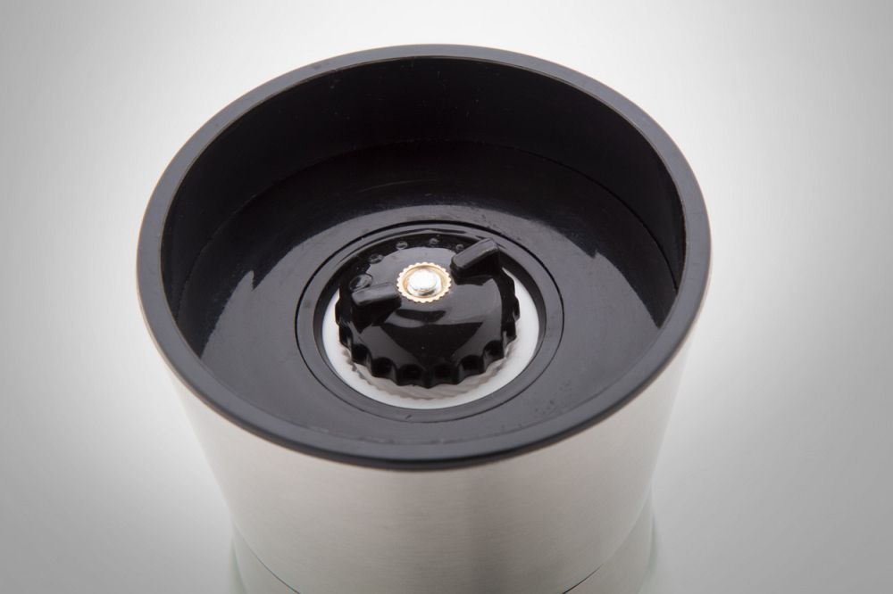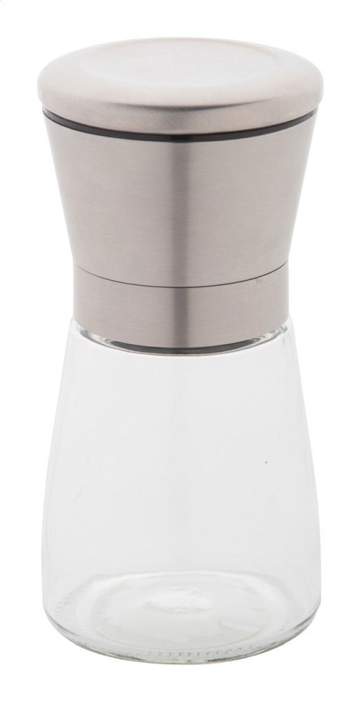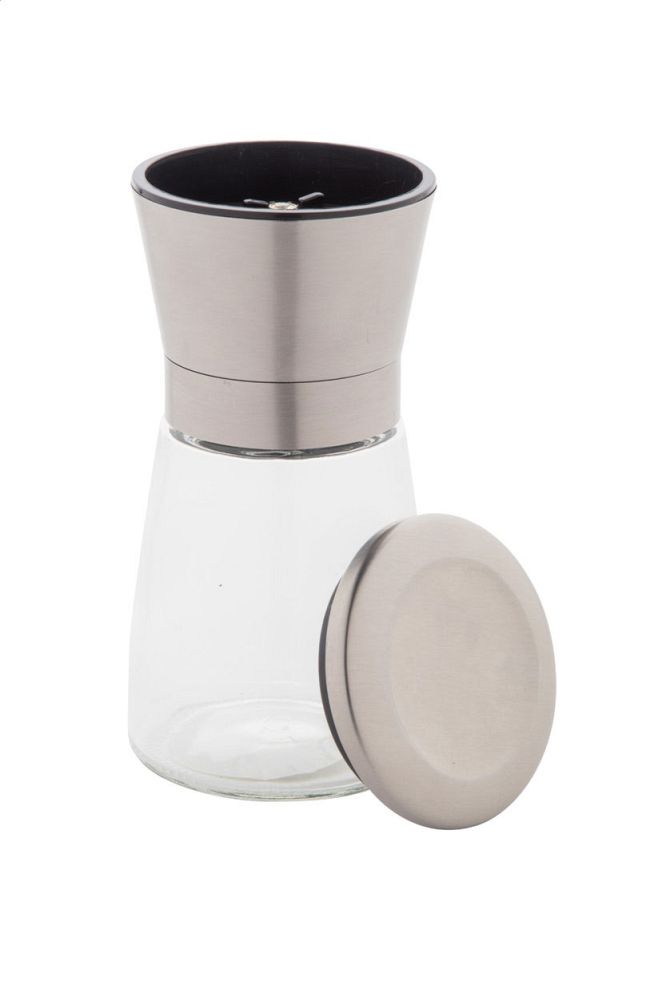 Nerezový ruční mlýnek na sůl a pepř s keramickým jádrem mlýnku a skleněnou nádobou, 180 ml. Rozměry: o 6,5 × 13,5 cm.