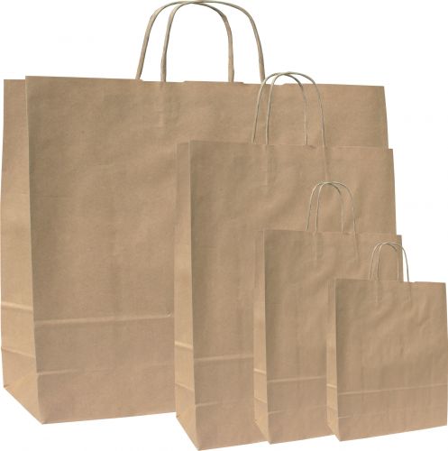 Hnědá papírová taška z EKO papíru, hnědé kroucené držadlo. Rozměry: 23 × 10 × 32 cm.