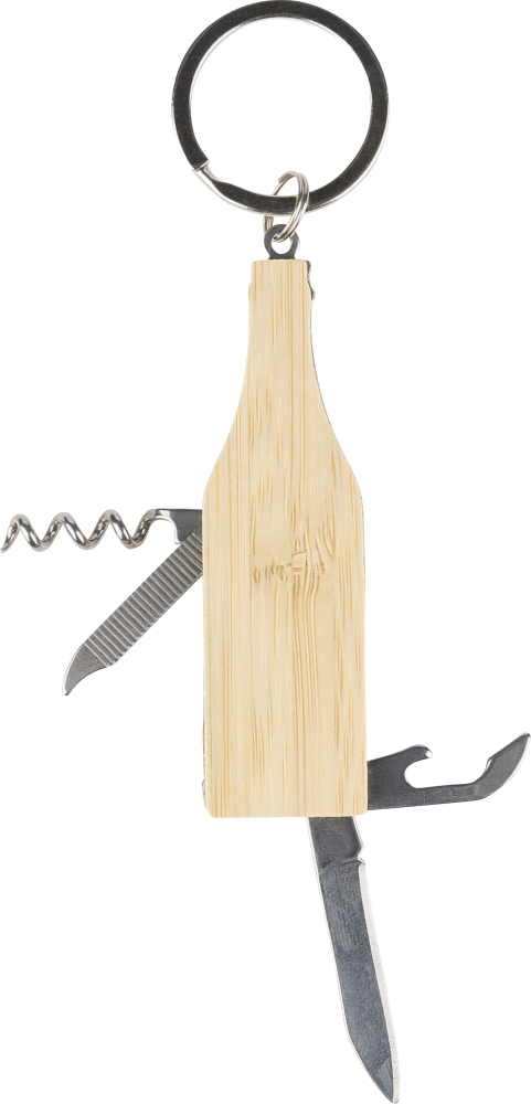 Multifunkční klíčenka z bambusu a nerezové oceli ve tvaru lahve s kovovým kroužkem. Součástí balení je vývrtka, pilník na nehty, otvírák na lahve a čepel. Jednotlivě baleno v hnědé papírové krabičce. Rozměry: 5,4 cm x 74,7 cm
