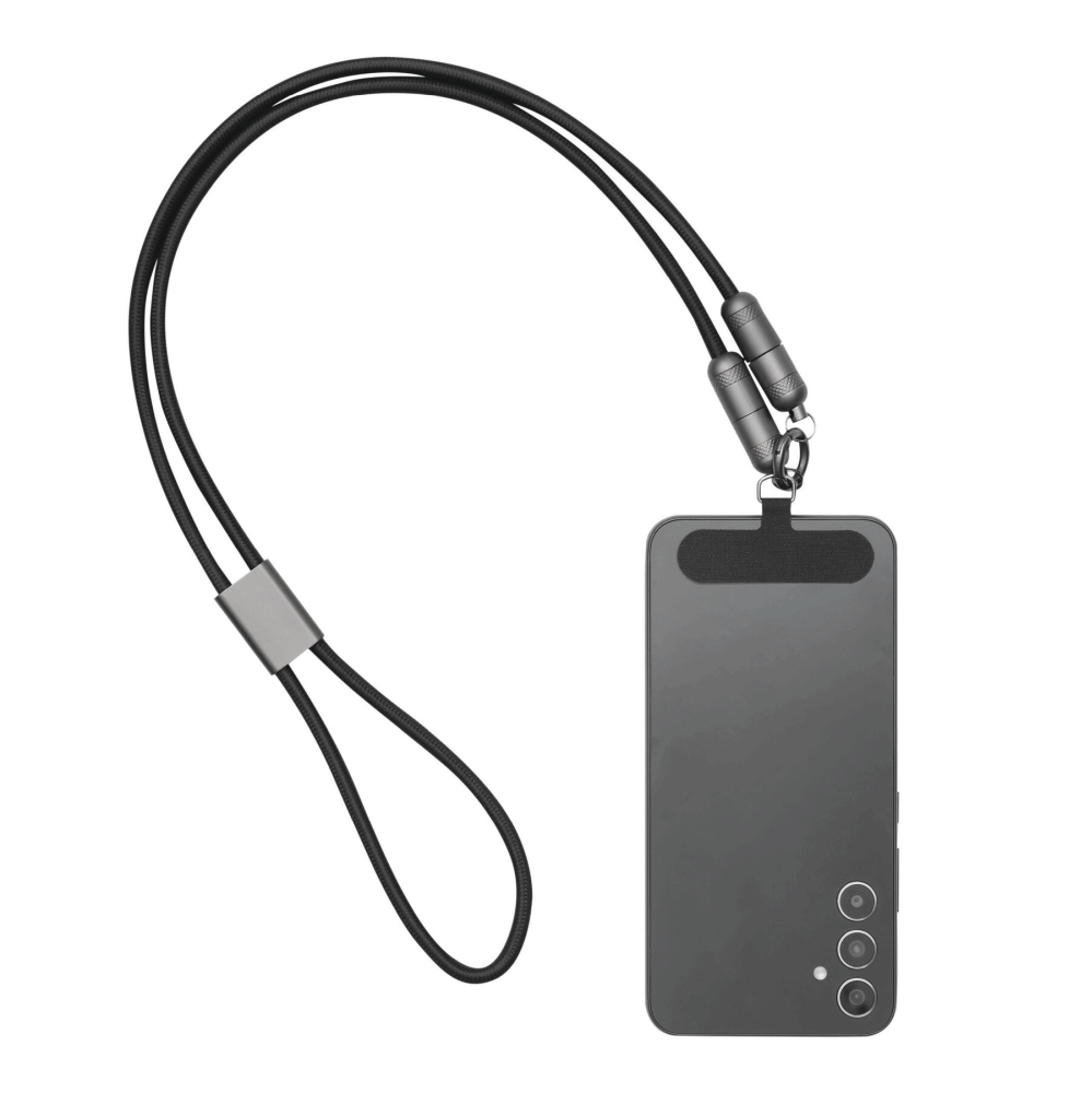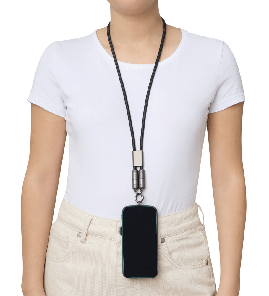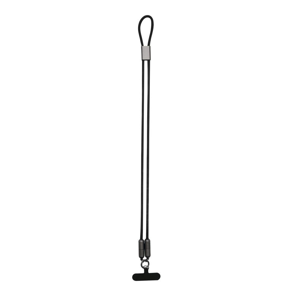Multifunkční nabíjecí a datový kabel pro nabíjení chytrých telefonů a zařízení napájených přes USB, včetně notebooků (výkon 65 W), a také pro přenos dat, obsahuje 2 nabíjecí konektory (USB typu C), délka kabelu cca 108 cm, nabíjecí a datový kabel slouží také jako šňůrka na telefon s upevňovací destičkou, kterou lze umístit mezi chytrý telefon a pouzdro (vhodné pouze pro pouzdra s plnou ochranou okrajů), obsahuje karabinu (karabina NENÍ vhodná pro lezení). Rozměry: 108 x 2,5 x 1,3 cm