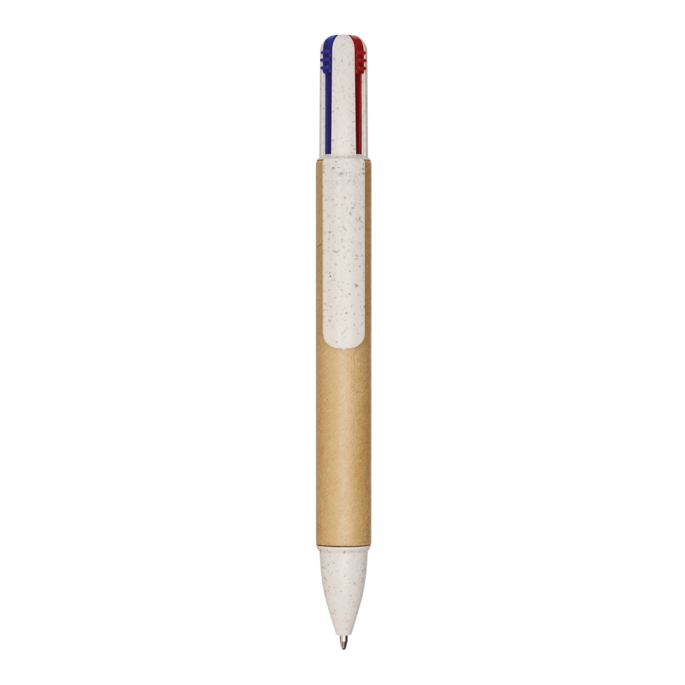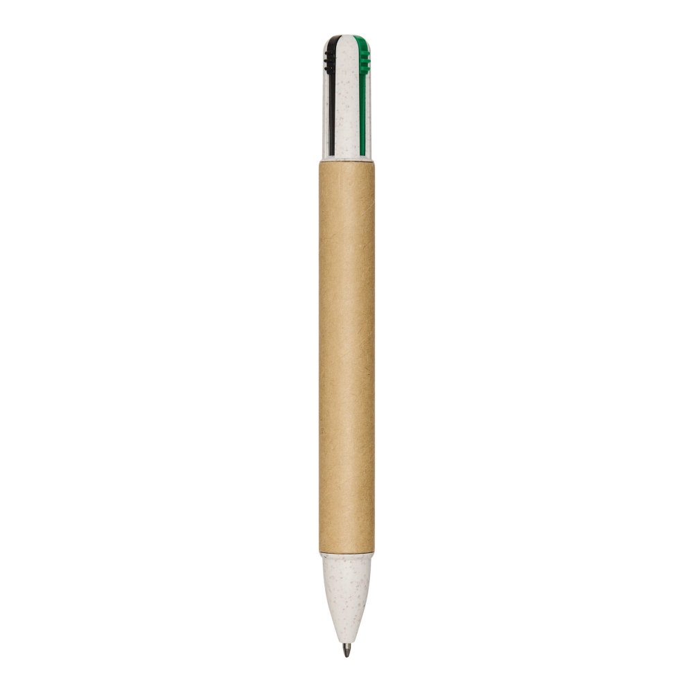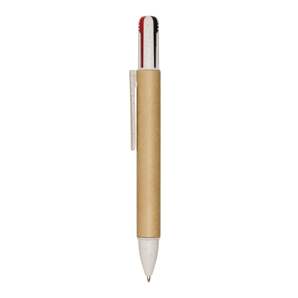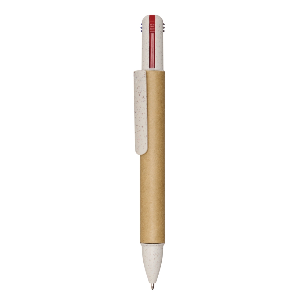 Multifunkční propiska, čtyři barvy. Vyrobeno z pšeničné slámy a ABS plastu, tělo potažené recyklovaným kartonem, tlačítkový mechanismus, náplně do kuličkového pera s černým, červeným, modrým a červeným inkoustem. Rozměry: 14,3 cm
