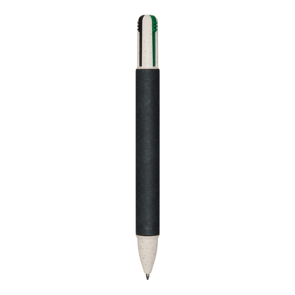 Multifunkční propiska, čtyři barvy. Vyrobeno z pšeničné slámy a ABS plastu, tělo potažené recyklovaným kartonem, tlačítkový mechanismus, náplně do kuličkového pera s černým, červeným, modrým a červeným inkoustem. Rozměry: 14,3 cm
