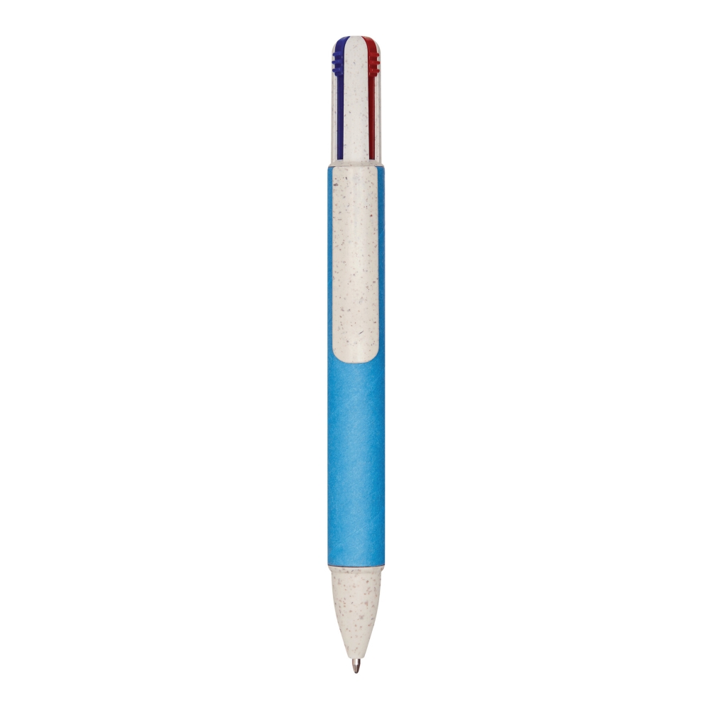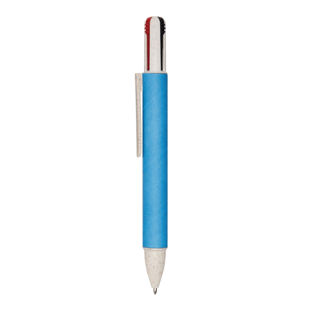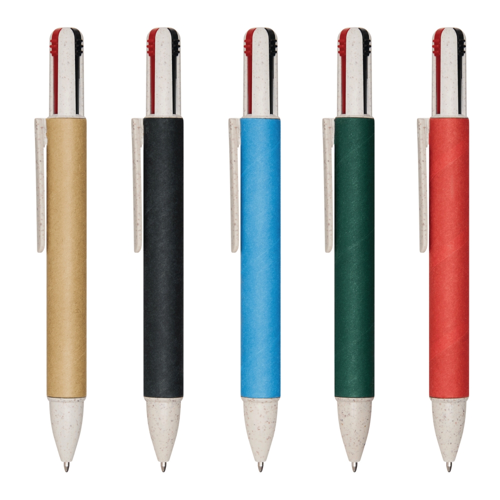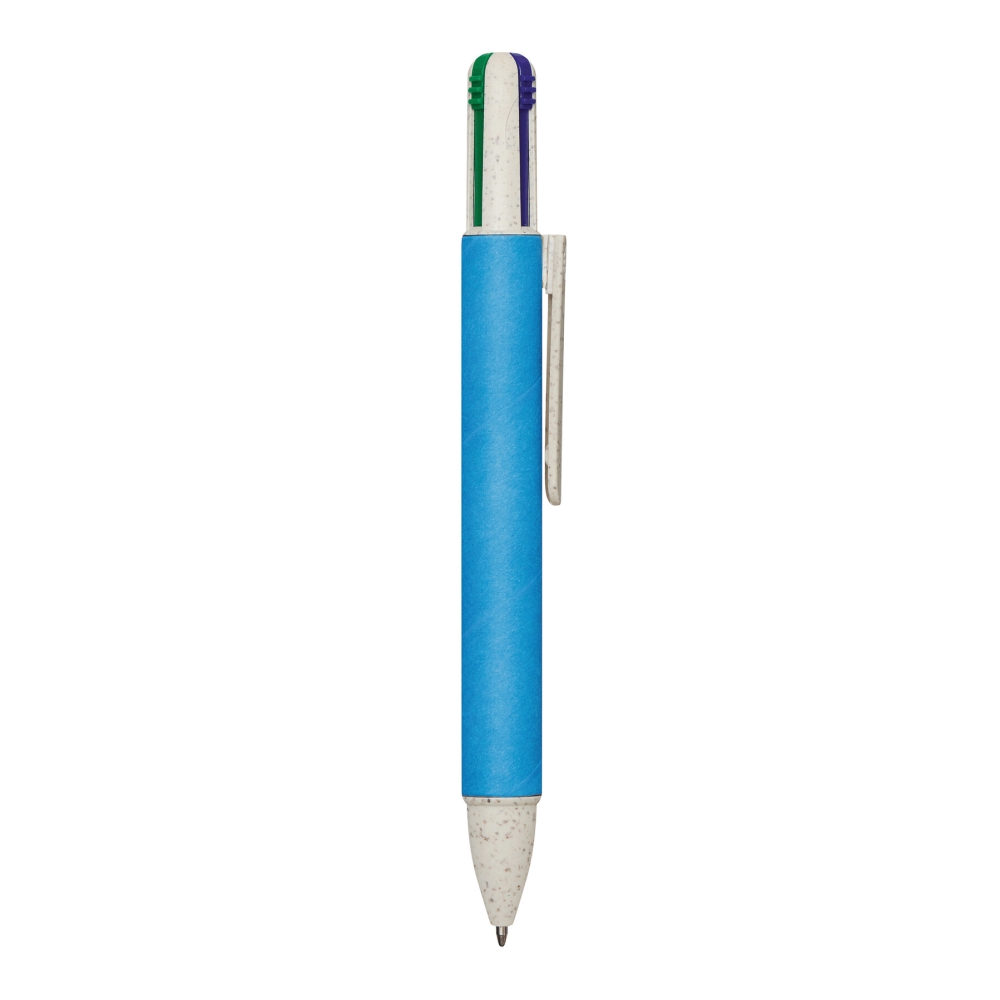 Multifunkční propiska, čtyři barvy. Vyrobeno z pšeničné slámy a ABS plastu, tělo potažené recyklovaným kartonem, tlačítkový mechanismus, náplně do kuličkového pera s černým, červeným, modrým a červeným inkoustem. Rozměry: 14,3 cm