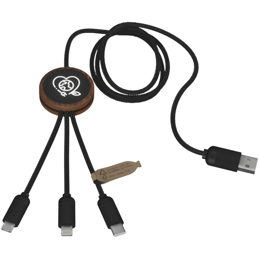 Nabíjecí kabel 3v1 z rPET se svítícím logem a kulatým bambusovým pouzdrem SCX.design C36, hnědá