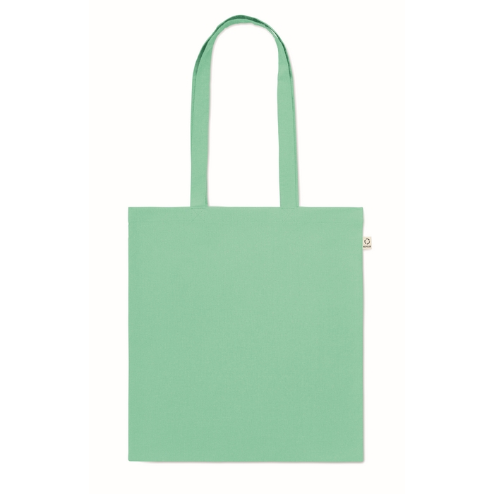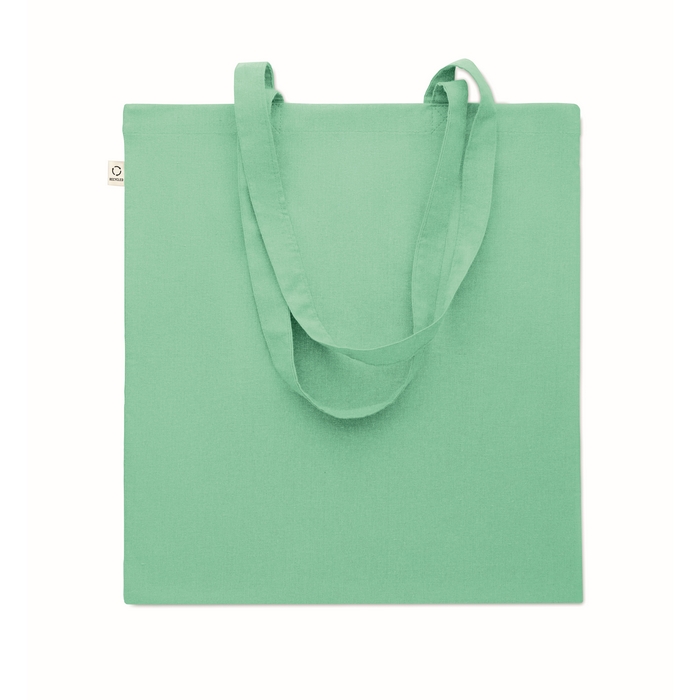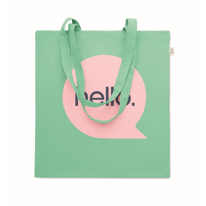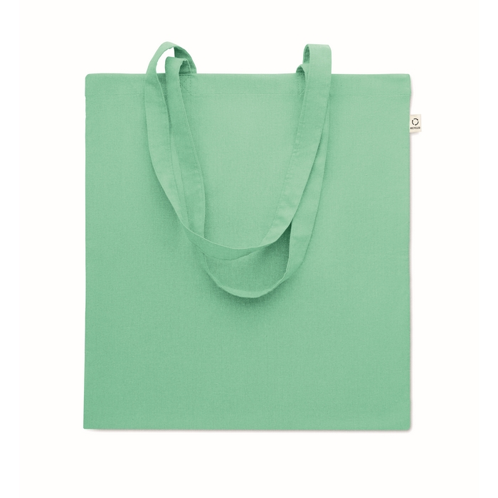 Nákupní taška z recyklované předspotřební bavlny (70 % recyklovaná bavlna a 30 % RPET) s dlouhými uchy. 140 gr/m2. Tato položka se po otisku může zmenšit. Rozměry: 38 x 42 cm