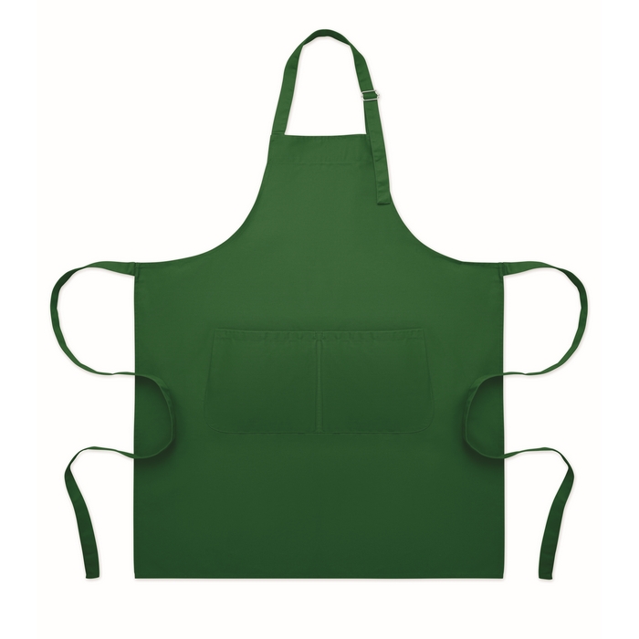 Dlouhá nastavitelná kuchyňská zástěra z polybavlny o gramáži 240 gr/m2 (35 % bavlna, 65 % polyester) se dvěma předními kapsami a nastavitelným popruhem s kovovou sponou. Rozměry: 75 x 90 cm