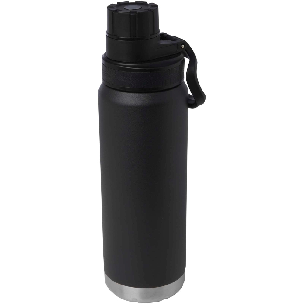 Dvoustěnná nerezová láhev na vodu s měděnou vakuovou izolací se šroubovacím nepropustným víčkem. Má široký otvor pro snadné plnění a čištění a pohodlnou rukojeť, která je součástí víčka. Vhodná na sycené nápoje. Odolná povrchová úprava na vnější straně. Dodává se v dárkové krabičce z recyklované lepenky. Objemová kapacita: 700 ml. Rozměry: 9 x 26 x 7 x O 7 cm