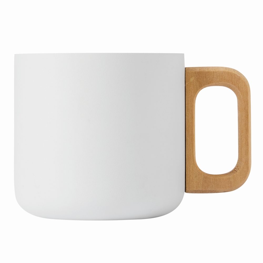 Nerezový hrnek, dvoustěnný s dřevěnou rukojetí, barevný matný práškový lak na vnější straně a stříbrný na vnitřní straně, kapacita cca. 350 mlO8,5 x 8 cm. Rozměry: O8,5 x 8 cm