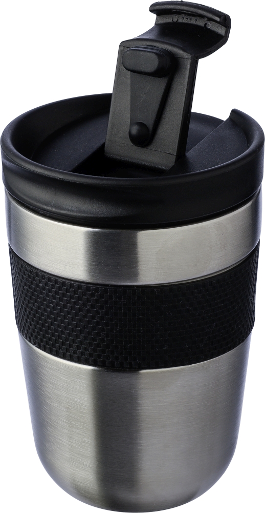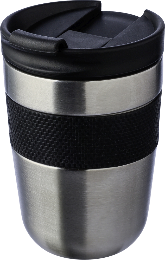 Nerezový dvoustěnný hrnek na pití (300 ml) s PP víčkem a silikonovým úchytem. Udrží obsah horký po dobu 4 hodin a studený po dobu 6 hodin. Interiér je vyroben z nerezové oceli 304 a exteriér je z nerezové oceli 201. Jednotlivě baleno v hnědé kartonové krabici.Rozměry: 8,5 x 8,5 x 13 cm