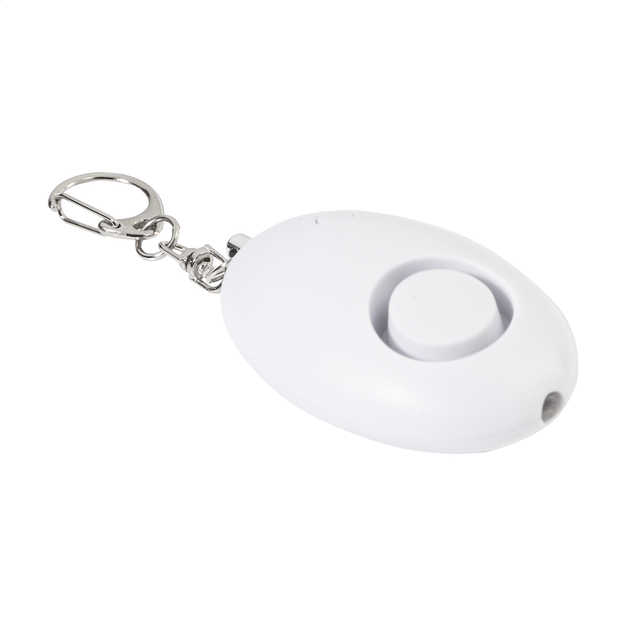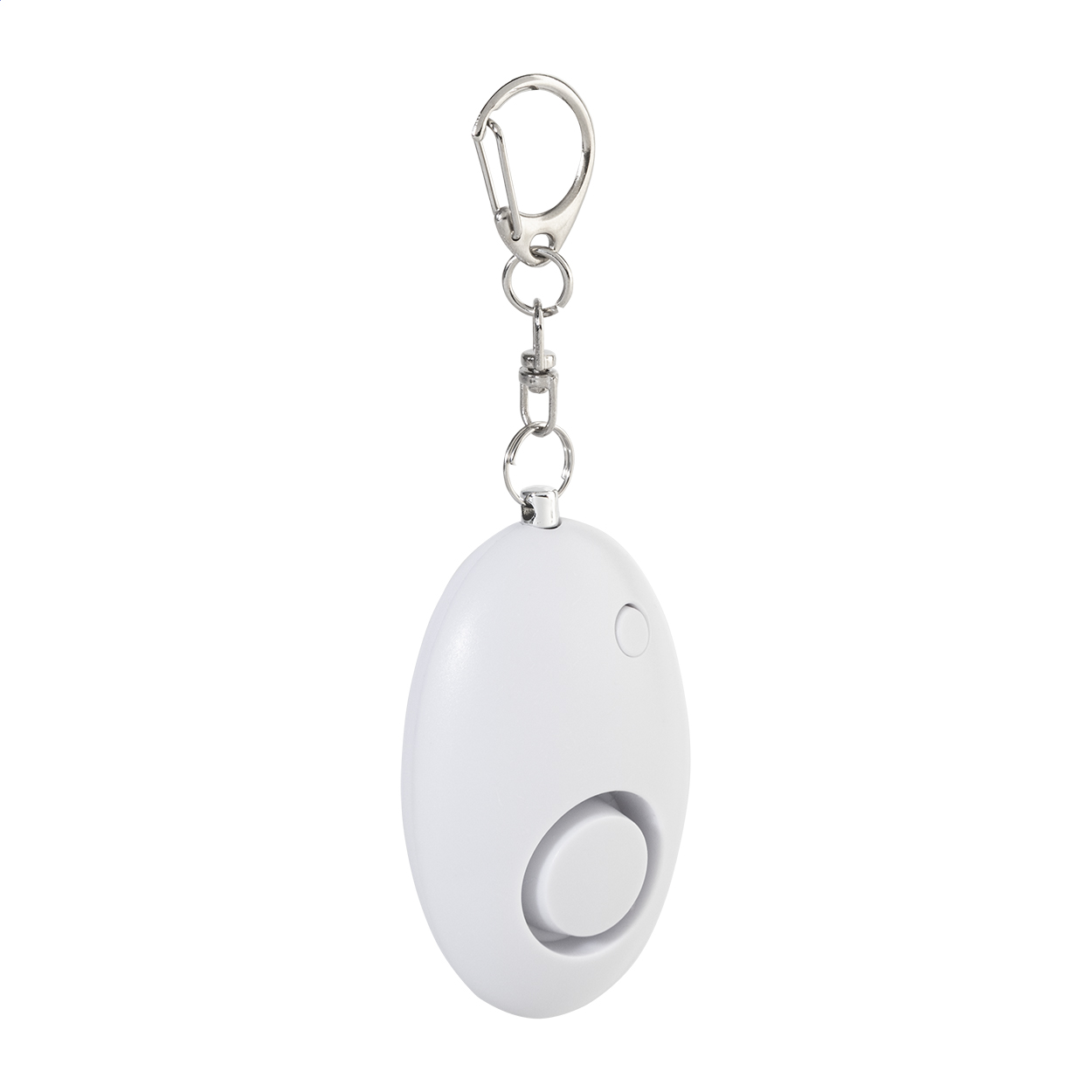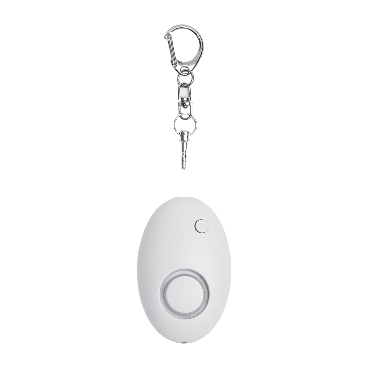 Osobní alarm z recyklovaného ABS materiálu s kovovou karabinou na klíče a 1 LED svítilnou. Alarm se aktivuje po zatažení za kolík. Hlasitost alarmu: cca 100 dB. S knoflíkovými bateriemi. Rozměry: 6,5×3,9×2,2 cm