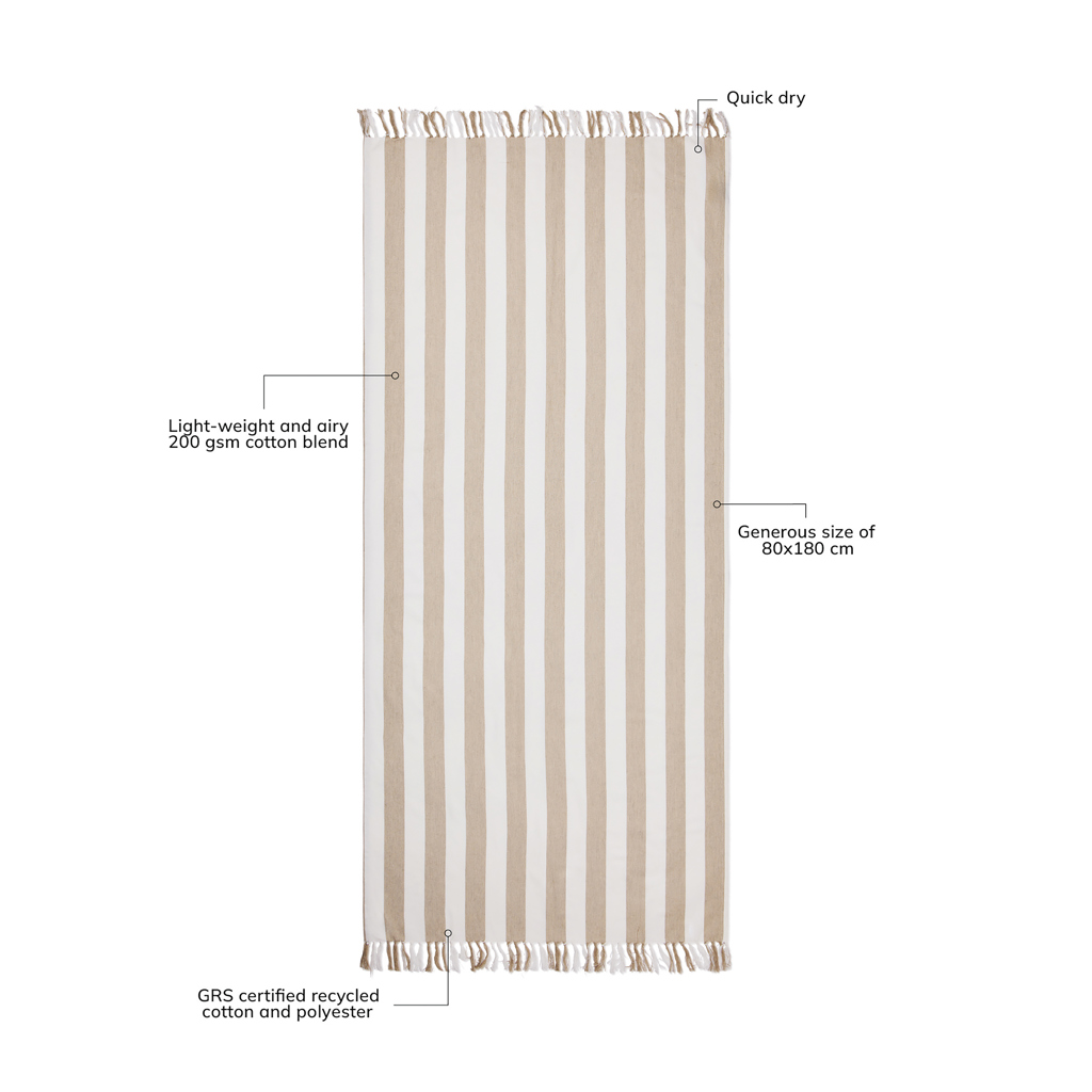 Plážová osuška hamam má klasický dvoubarevný pruhovaný vzor s třásněmi. Je vyrobena z lehké a vzdušné směsi o gramáži 200 g/m2 a kombinuje pohodlí bavlny s rychleschnoucími vlastnostmi polyesteru. Rozměry 80x180 cm jsou ideální na pláž nebo k bazénu. Certifikát GRS zaručuje, že celý dodavatelský řetězec recyklovaných materiálů je certifikován. Celkový obsah recyklovaného materiálu se odvíjí od celkové hmotnosti výrobku. Tento výrobek obsahuje 69 % recyklované bavlny s certifikací GRS a 29 % recyklovaného polyesteru s certifikací GRS.