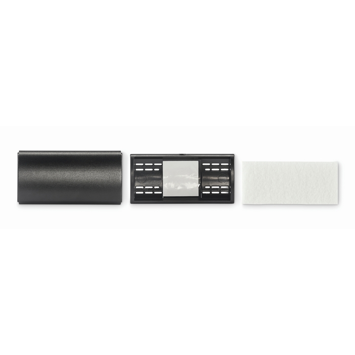 Osvěžovač vzduchu do auta s hliníkovým krytem a klipem ABS. Vnitřní plstěná vložka z RPET pro aroma kapalinu (není součástí dodávky). Rozměry: 5.8 x 4.9 x 2.8 cm