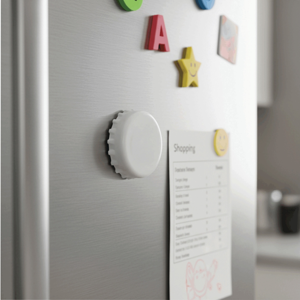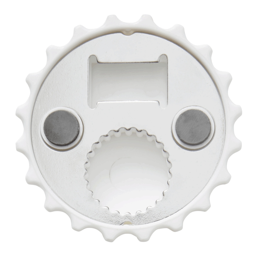 Otvírák na lahve: vhodný pro korunkové uzávěry a kovové šroubovací uzávěry, se dvěma magnety pro připevnění např. k lednici. Rozměry: O8 x 1,8 cm