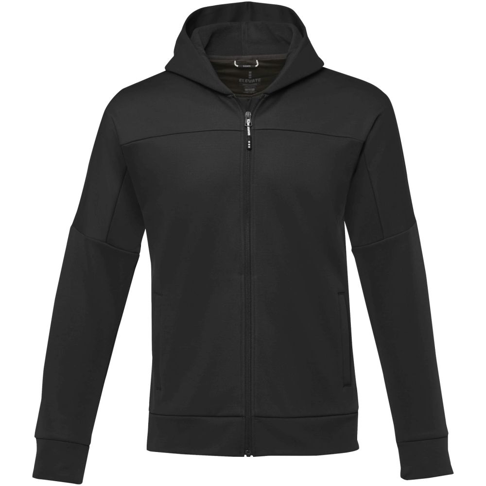 Pánská celopropínací pletená bunda s kapucí, značka Elevate. Přední kapsy. Kartáčované na vnitřní straně. Značkové závěsné poutko. Saténový nákrčník. Vnitřní port na sluchátka s průtahem na kabel. Potisk štítku technologií heat transfer pro větší pohodlí. Úplet 70% polyester, 30% Sorona®, 245 g/m2.