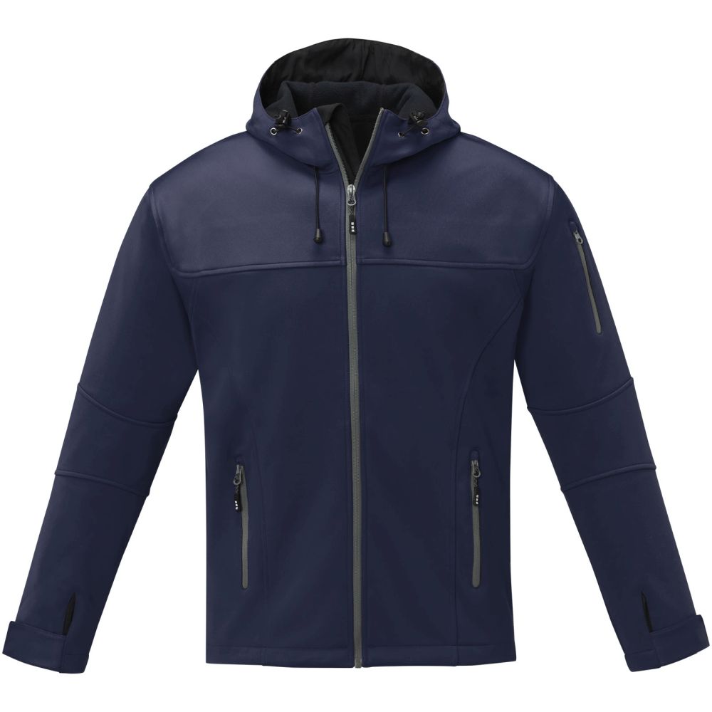 Pánská softshellová bunda s kapucí, značka Elevate. Bunda má voděodolnost 3000 mm a prodyšnost 3000 g/m2, spuštěný zadní lem, elastickou stahovací šňůrku s nastavitelným zámkem šňůrky, nastavitelné manžety se zapínáním na suchý zip, přední kapsy se zipy, kapsu na rukávu se zipem, středový přední kontrastní otočný zip. Jednolící žerzej 90% polyester, 10% elastan, 360 g/m2, Bonding, Mikro fleece 100% polyester. Kartonové množství v ks: 12