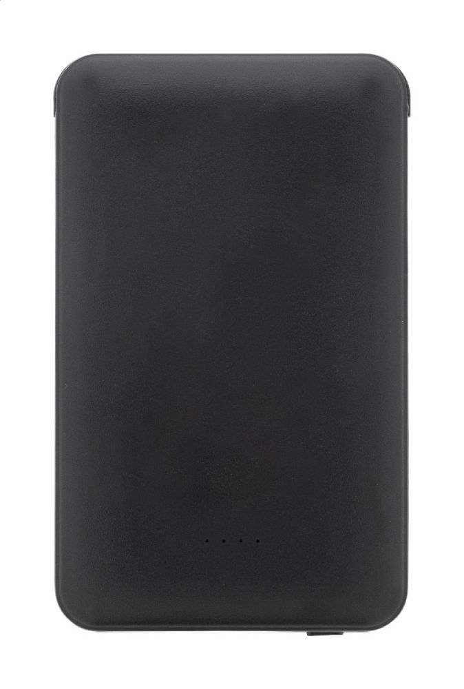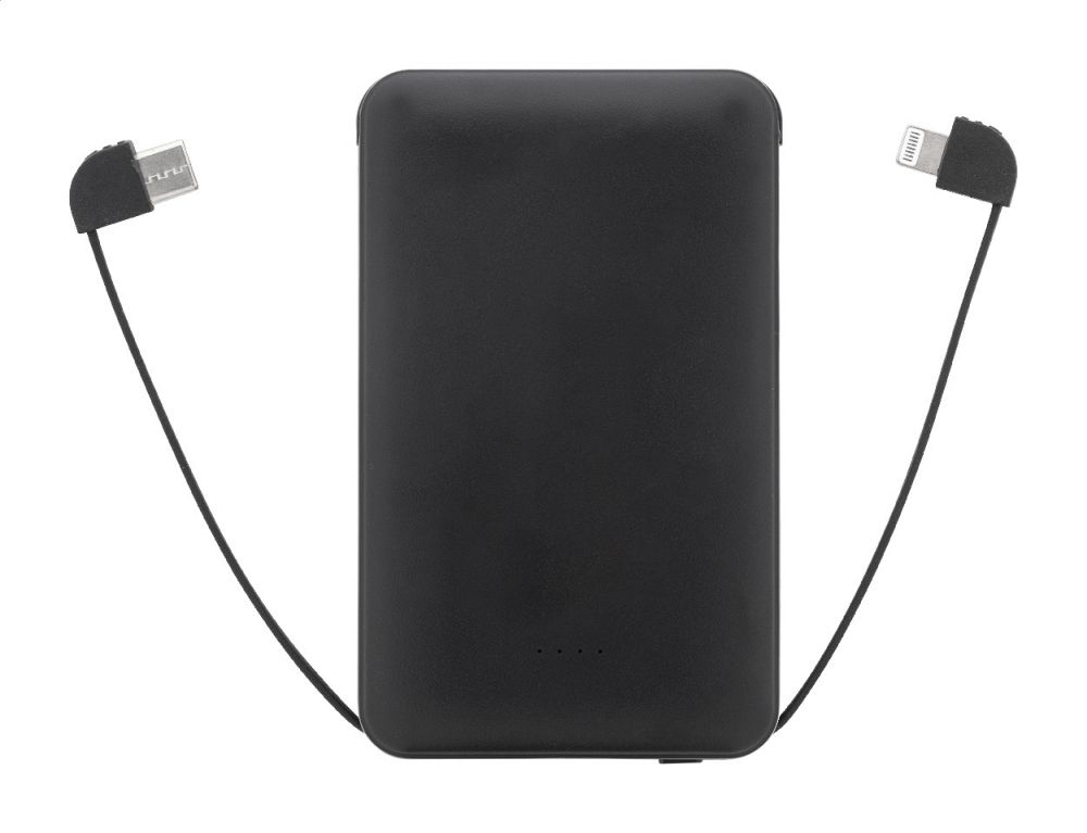 Power banka z recyklovaného ABS plastu s baterií 5 000 mAh a integrovanými nabíjecími kabely s konektory micro USB, USB-C a Lightning. S nabíjecím portem USB a vstupním portem USB-C. Včetně nabíjecího kabelu USB. Rozměry: 6,3 × 10,4 × 1,3 cm.