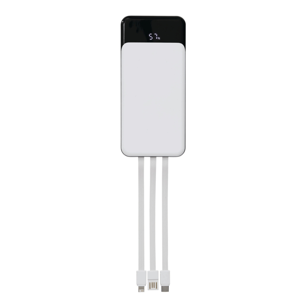 Powerbanka vhodná pro chytré telefony a zařízení připojená přes USB, obsahuje 3 integrované nabíjecí kabely na zadní straně (USB Type-C, Lightning, USB Type-A), indikátor stavu baterie v procentech, vypínač, 2 vstupní/výstupní porty USB Type-C a 1 výstup USB Type-A, vstup: 5V/2A, výstup: 5V/2A (max.), kapacita: 10 000 mAh, vysoce výkonná lithiová baterie, baleno v dárkové krabičce. Rozměry: 14,5 x 6,8 x 1,8 cm