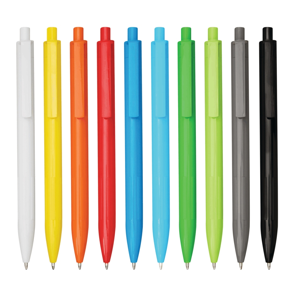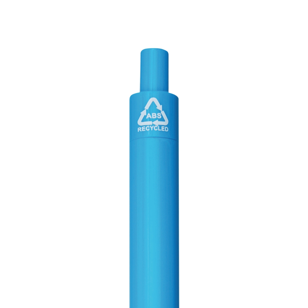 Propiska z recyklovaného plastu, žebrovaná úchopová zóna, klikací mechanismus, modrý inkoust. Rozměry: 13,7 cm