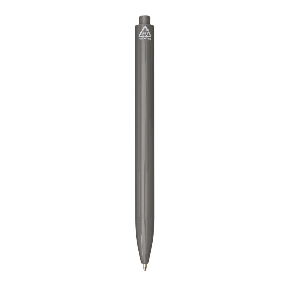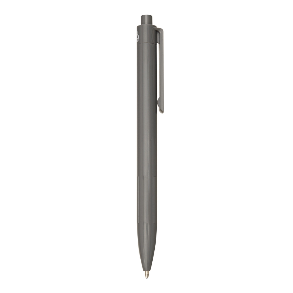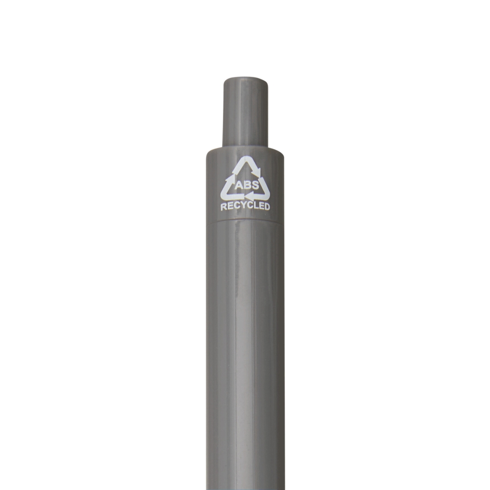 Propiska z recyklovaného plastu, žebrovaná úchopová zóna, klikací mechanismus, modrý inkoust. Rozměry: 13,7 cm