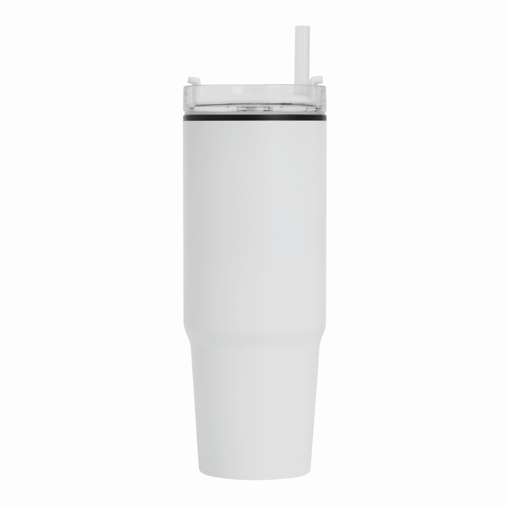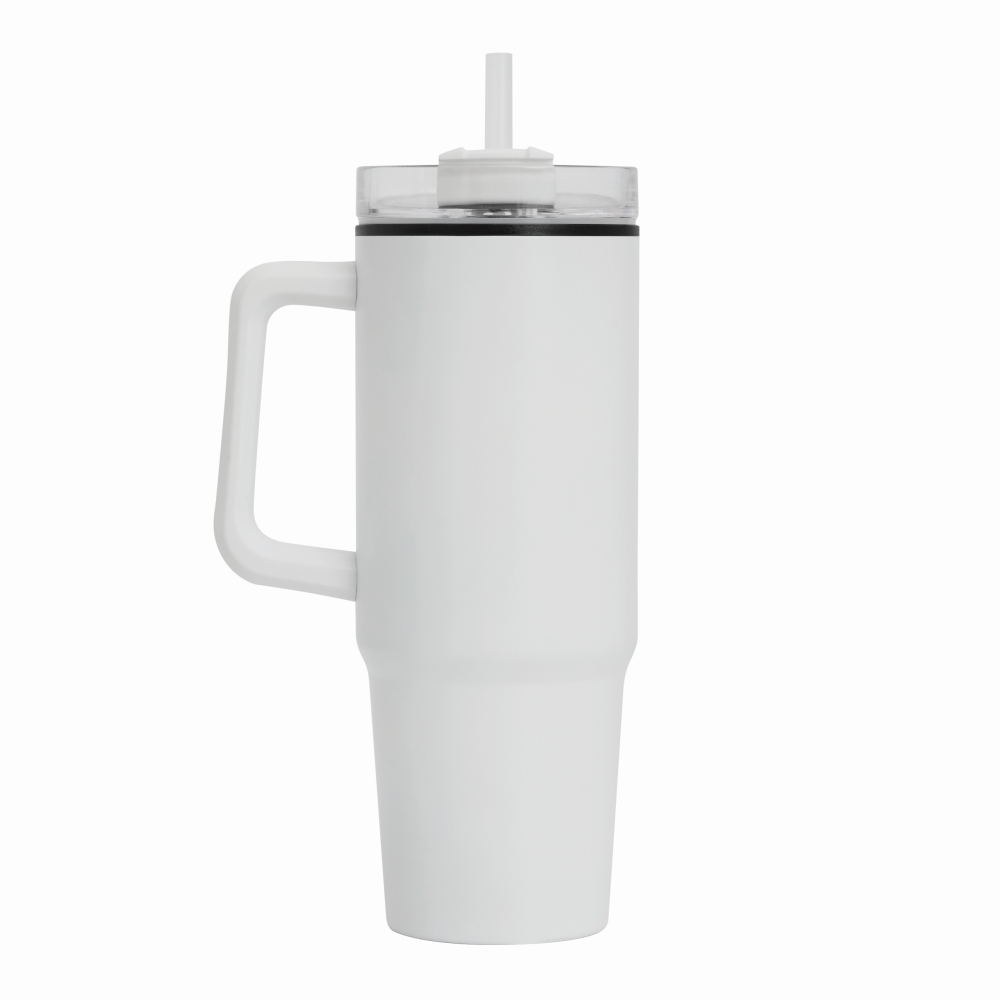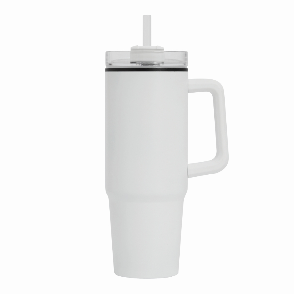 Dvoustěnný hrnek XXL, jehož vnitřek je vyroben z plastu a vnější část z nerezové oceli o objemu 900 ml. Hrnek má praktickou rukojeť, transparentní plastové víčko se šroubovacím uzávěrem, silikonový těsnící kroužek, otvor na pití s otočným krytem a průhledné brčko. Rozměry: O 8,8 × 24 cm.