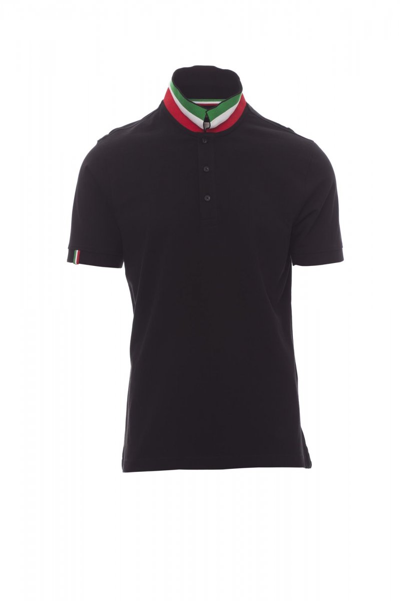 Pánská polokošile s krátkým rukávem s 3 barevně sladěnými perleťovými knoflíky, barevně sladěný límeček s kontrastním rubem v barvách italské vlajky, který je vidět pouze při zvednutí, barevně lemovaný pravý rukáv ve stejné barvě jako límeček, žebrovaný límeček a lemy rukávů, postranní rozparky v barvách italské vlajky, skryté prošití límečku s žerzejovým úpletem rovněž v barvách vlajky, postranní vyztužovací páska, tvarovaná výztuž na spodní straně límečku.