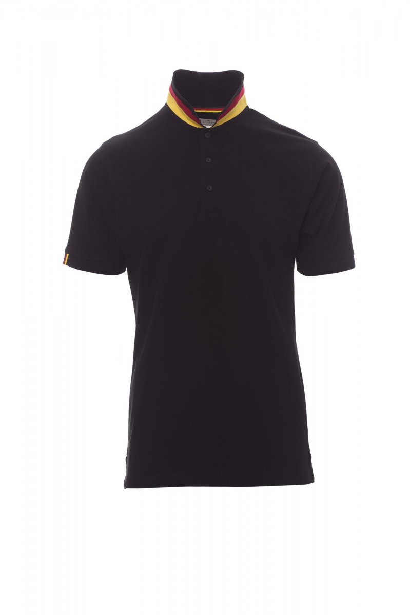 Pánská polokošile s krátkým rukávem s 3 barevně sladěnými perleťovými knoflíky, barevně sladěný límeček s kontrastním rubem v barvách italské vlajky, který je vidět pouze při zvednutí, barevně lemovaný pravý rukáv ve stejné barvě jako límeček, žebrovaný límeček a lemy rukávů, postranní rozparky v barvách italské vlajky, skryté prošití límečku s žerzejovým úpletem rovněž v barvách vlajky, postranní vyztužovací páska, tvarovaná výztuž na spodní straně límečku.