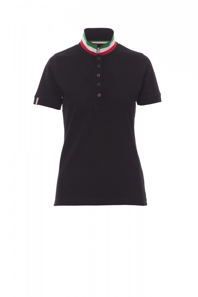 Dámská vyštíhlená polokošile s krátkým rukávem s 5 barevně sladěnými perleťovými knoflíky, barevně sladěný límeček s kontrastním rubem v barvách italské vlajky, který je vidět pouze při zvednutí, barevně lemovaný pravý rukáv ve stejné barvě jako límeček, žebrovaný límeček a lemy rukávů, postranní rozparky v barvách italské vlajky, skryté prošití límečku s žerzejovým úpletem rovněž v barvách vlajky, postranní vyztužovací páska, tvarovaná výztuž na spodní straně límečku.