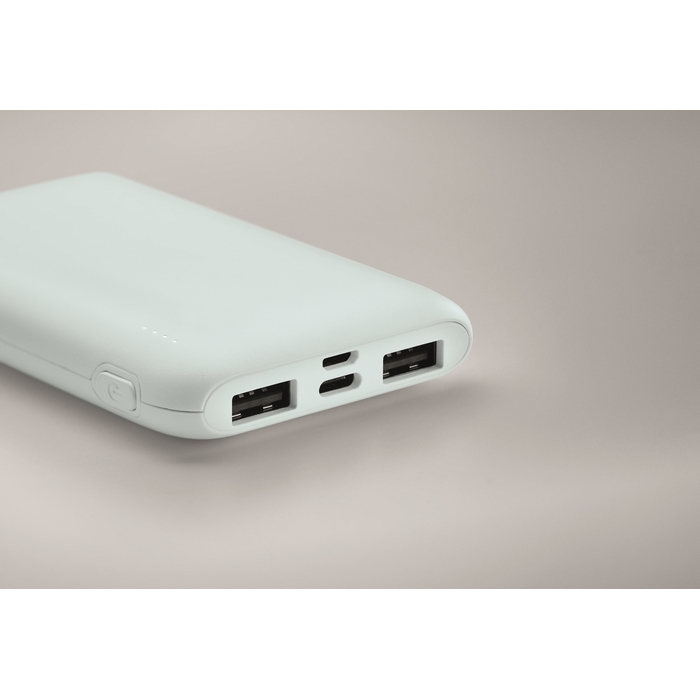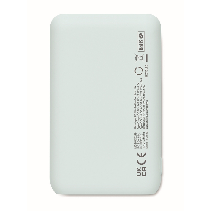 Powerbanka 5000 mAh z recyklovaného ABS. Výstupní proud DC5V/2A. 2x USB type A a 1x type C in/out a 1x type micro-B in. Rozměry: 9,9 x 6,2 x 1,5 cm